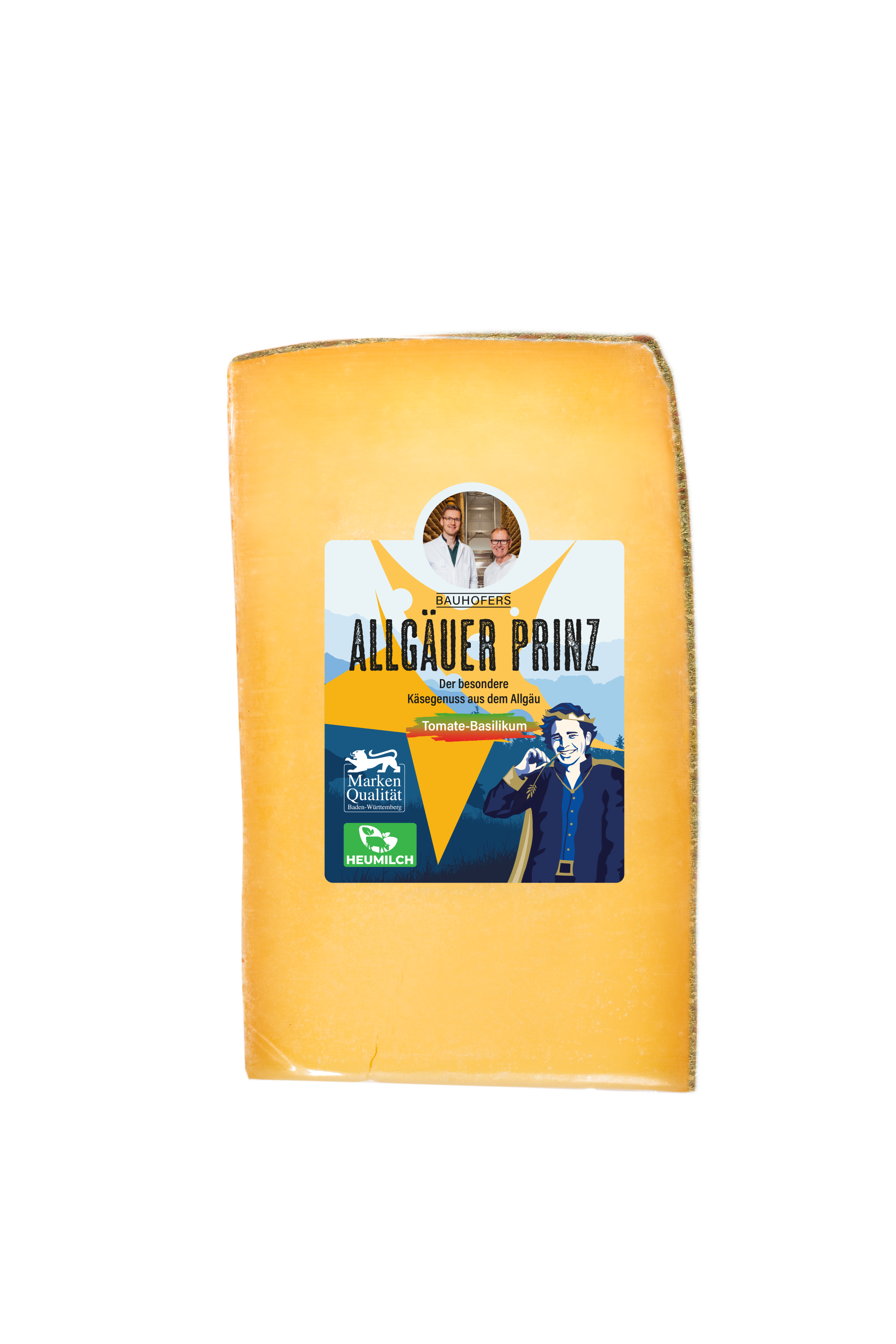 Der Käse mit würzigem Geschmack, einer feincremigen Konsistenz und einer rötlichen Rinde aus Rotkulturen wird mit Tomaten-Basilikum-Kräutern affiniert.
